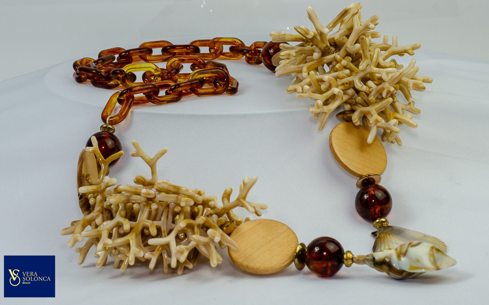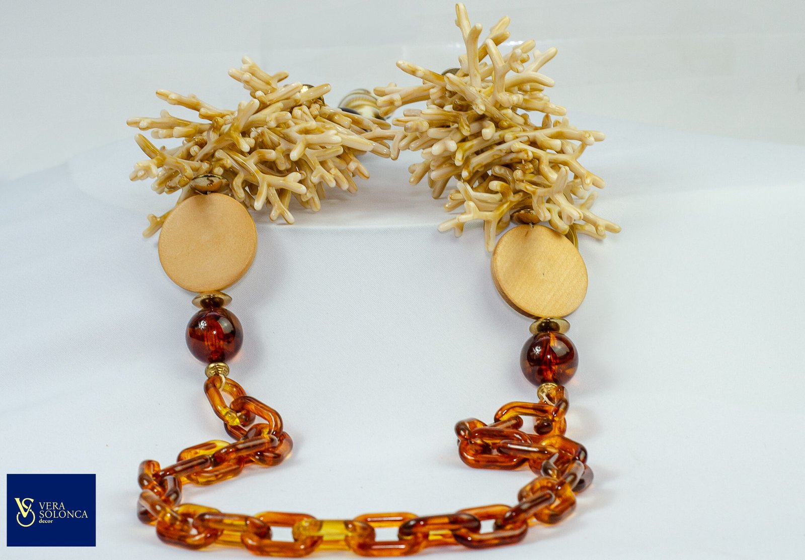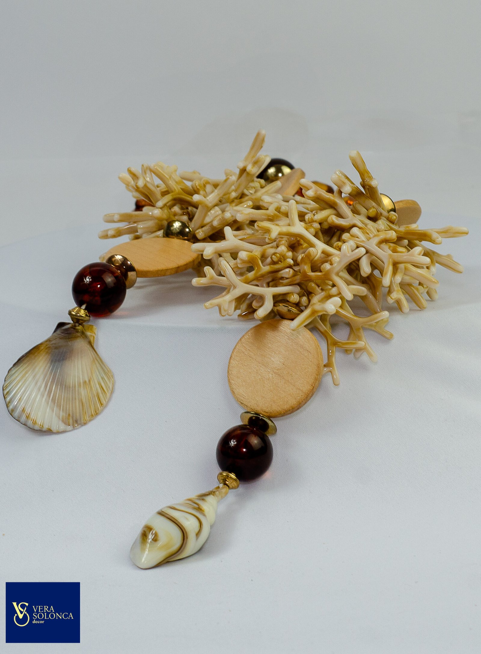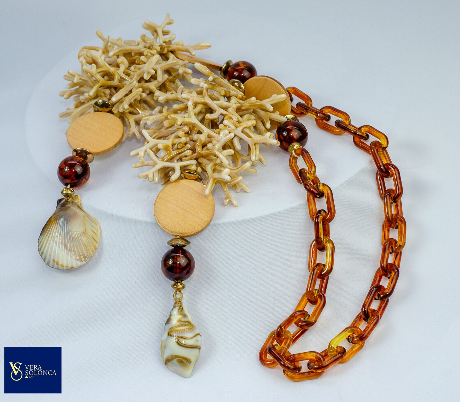 Colar de mesa com corais creme formando cachos, elos em acrílico na cor tartaruga, peças de madeira achatada na cor marfim, bolas de resina, acabamento nas pontas com pingentes em resina em dois formatos de conchas, abs dourados, confeccionado em fio encerado com 1,23 de comprimento. Uma peça para ousar na decoração. Bonito, diferente e rico em detalhes.